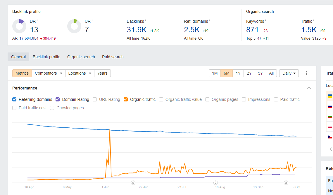 Сайт був не оптимізаований, структура сторінок і сайту не відповідала пошуковому попиту, не було категорій товарів, здебільшого ранжувалися товари. Були тисячі спамних посилань, які відмінили в GSC. На графіку Ahrefs видно к-сть посилань з них більшість це був спам. Тому робота велася по всіх напрямках.